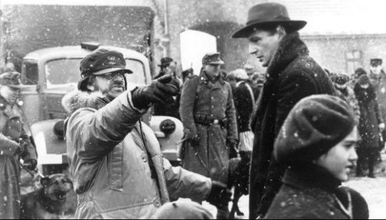 Featured image: Director Steven Spielberg with cast on the film set of Schindler’s List (1993).